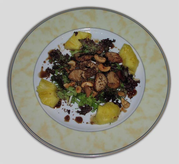 Zet voor het serveren de pan weer op het vuur. Snijd de kalkoenhaasjes in schuine plakken. Schep ze met de spek reepjes in de pan, bedruppel ze met de helft van de balsamico dressing en laat omscheppend doorwarmen. Verdeel de sla en taugé over de borden en bedruppel met de resterende dressing. Verdeel de warme kalkoenplakjes en de spekjes over de sla. Bestrooi met de cashewnoten en het sesam zaad en garneer met plakjes ananas. Meteen serveren.