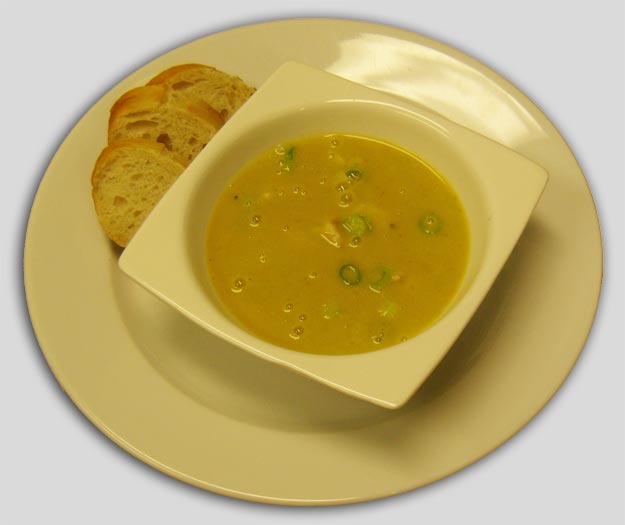 Snijdt de prei in fijne stukken en was deze grondig. Fruit de prei aan in de boter, enkele minuten smoren en dan de rasp van 1,5 sinaasappel toevoegen. Roer de bloem erdoor een maak de roux gaar. Giet dan de bouillon met de koksroom en het sinaasappelsap van 1,5 sinaasappel erbij. Breng de soep aan de kook en laat gedurende 20 minuten zachtjes koken. Vervolgens met de staafmixer het geheel fijn malen. Snijdt de forel in kleine blokjes. Vlak voor het serveren de soep opnieuw aan de kook brengen. Verdeel de blokjes forel met de fijngesneden bosuitjes in de soepkoppen en giet de soep in de kopjes.