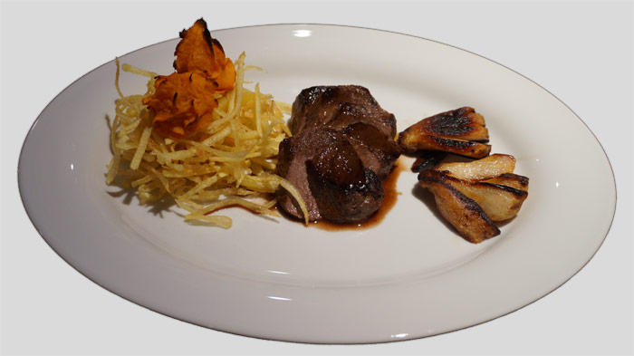 Hertebiefstukjes in rode wijn met gebakken peer en aardappelnestjes