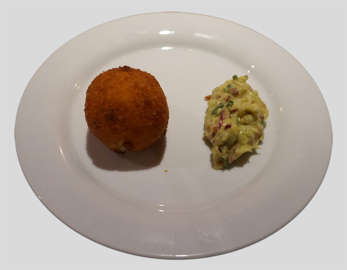 Maak nu de guacamole-achtige dressing. Schraap het avocadovruchtvlees in een kom. Breng op smaak met zout en peper en knijp er het sap van 2 limoenen bij. Rasp de ui en tomaat erbij en stamp tot een grove guacamole. Hak de koriander en voeg die toe met flink wat olie. Zet apart.