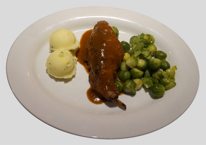 De konijnen bouten royaal inwrijven met wildkruiden. Daarna de bouten in een grote pan bruin bakken. De bouten eruit en de groenten even bakken dan de bouten er weer bij samen met wat van het marinade-vocht. Dit alles op een klein vuur gaar laten worden.