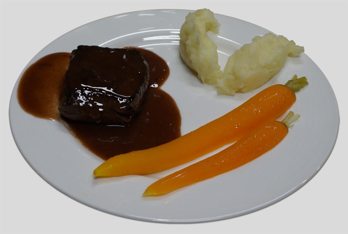 Droog het vlees, bestrooi met peper en zout en bak in een pan rondom bruin. Gebruik dezelfde pan voor het maken van de saus. Leg het vlees op het rooster van een braadslee en zet de oven op 130 graden met en een kerntemperatuur van 58 graden. Haal het vlees uit de oven en laat luchtig rusten onder aluminiumfolie in de warmhoudkast.