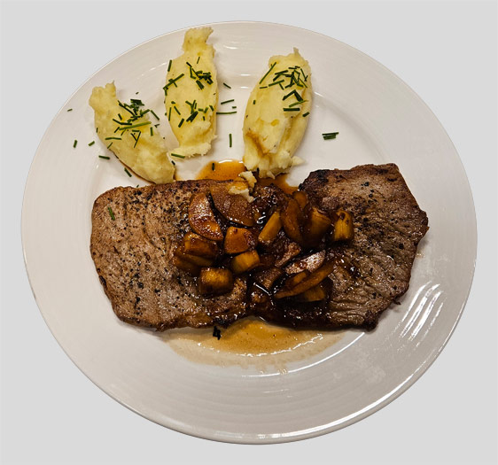 Entrecote met bierjus, aardappelpuree en gekaramelliseerde pastinaak