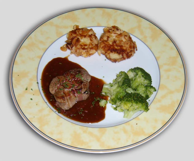| Kalfsoester gevuld met een mengsel van zwarte olijven en gedroogde abrikozen in een zachte madera saus | Hoofdgerecht |