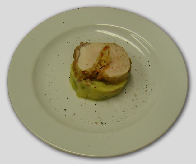 | Gevulde varkensrollade met een stamppotje van spruitjes en appel | Hoofdgerecht |